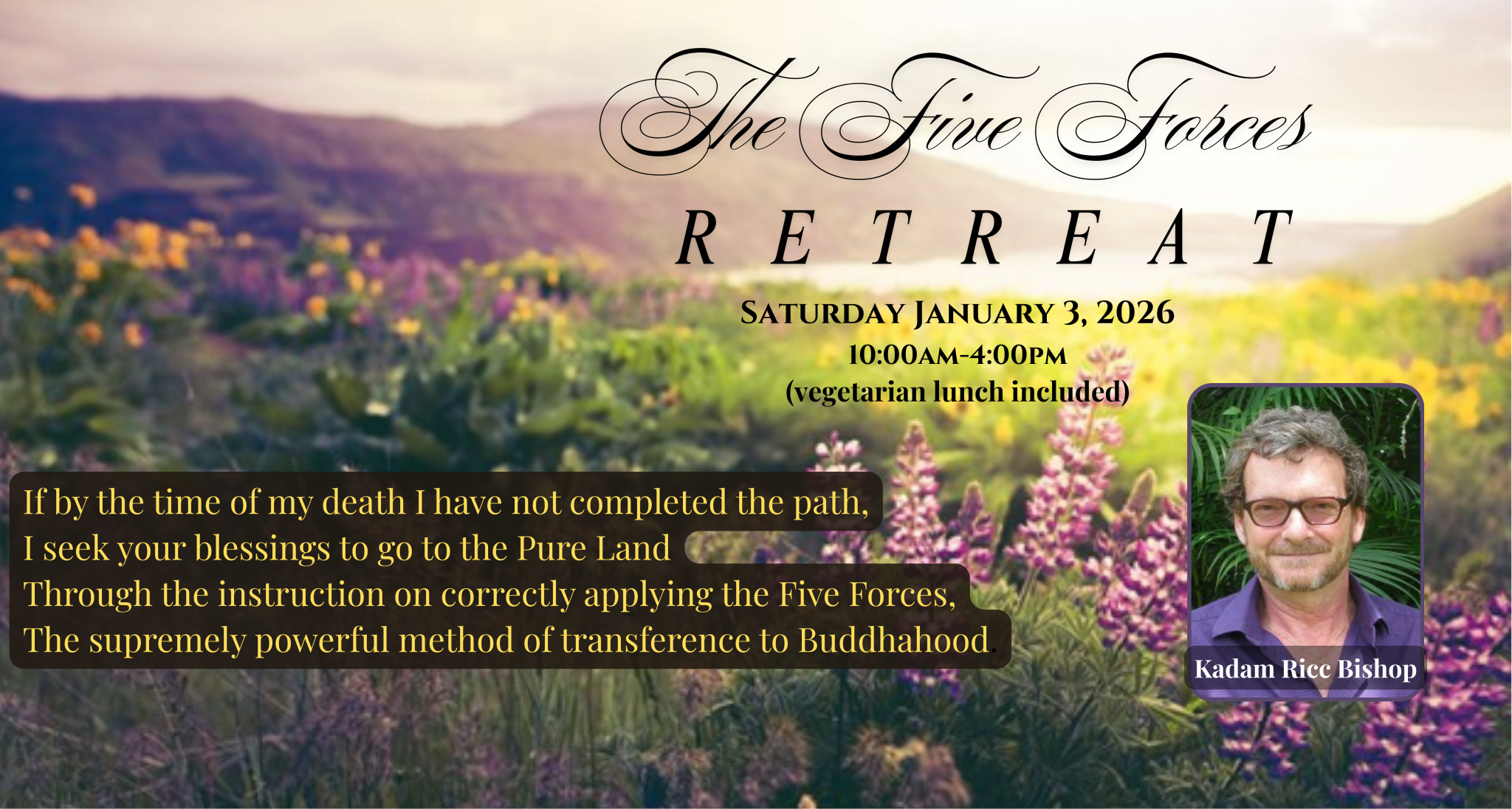 In this special Retreat Kadam Ricc Bishop will explain the practice of the Five Forces. These blissful instructions and meditations will open our eyes to the pathway to the Pure Land while enriching our daily life right now. You do not need to live an ordinary life or have an ordinary death. The practice of the Five Forces is the supreme instruction for both our current and future happiness. We are so fortunate to have these wonders in our mind.